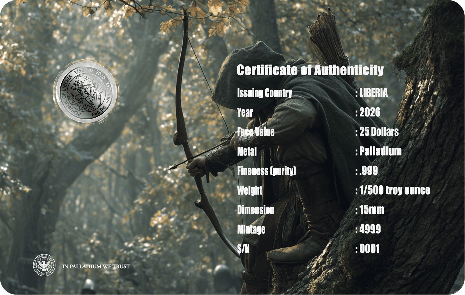 2025 Liberia Robin Hood 1/500 oz Palladium Coin in Card (04/20)