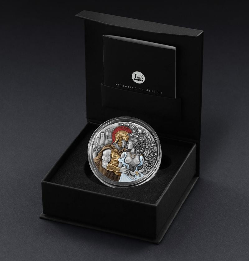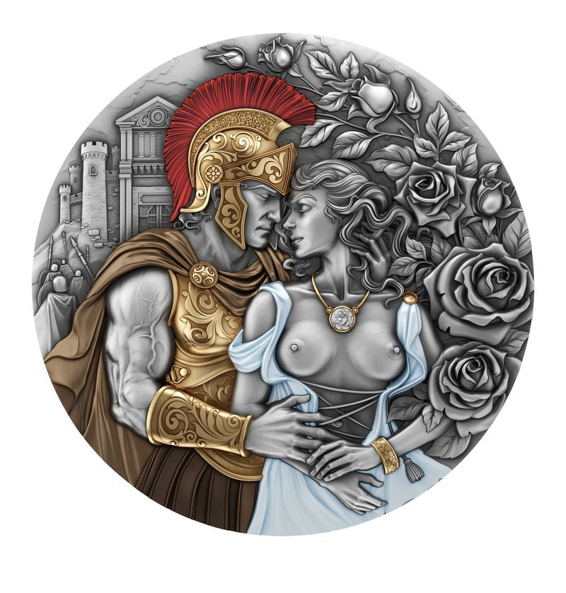This coin embodies the idea that war and love arise from the same primal force — passion, desire, and irresistible attraction. These are two distinct, yet equally powerful energies. Ares and Aphrodite emerge not only as deities, but as timeless archetypes revealing the nature of longing, power, and desire. Aphrodite’s beauty is accentuated by her symbols — blooming roses, long associated with passion and seduction. She is portrayed as tall, graceful, and radiant, her neck adorned with a certified diamond, a delicate 0.02 ct gem shimmering like the very light of love.