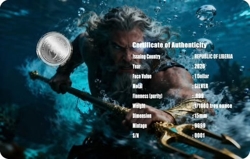 Discover this exclusive 2026 Liberia Poseidon silver coin, a numismatic treasure for collectors. Struck in .999 pure silver with a weight of 1/1000 troy ounce, this limited mintage piece features a 15mm diameter design. Issued by the Republic of Liberia with a face value of 1 Dollar, each coin arrives beautifully presented in protective card packaging. With only 9,999 pieces minted worldwide, this is a rare addition to any precious metals collection.