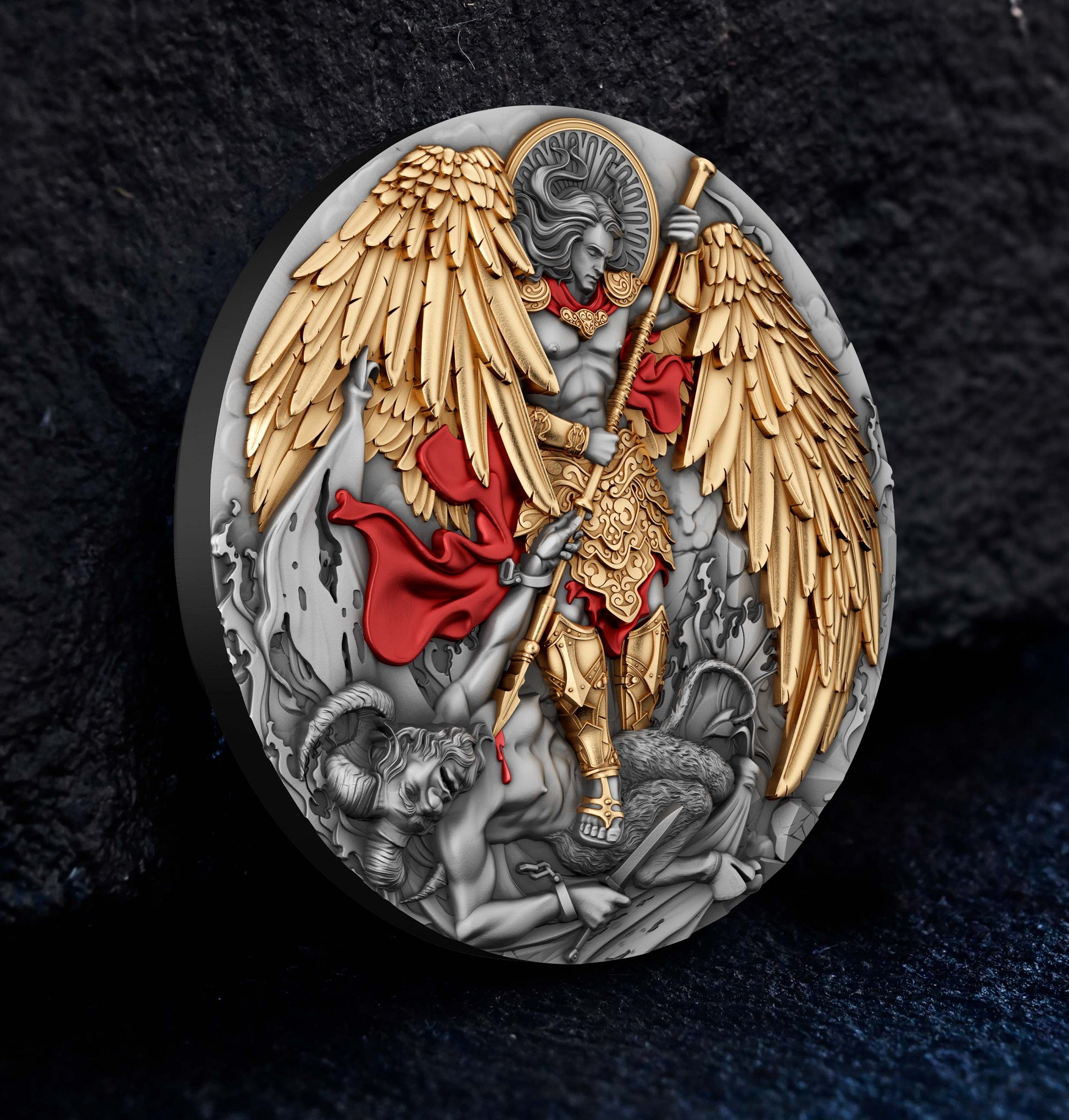 Let’s discover the realm of the infinite sky with our new silver collectible coin, St. Archangel Michael — the first release in the Archangels series. This silver coin symbolizes the triumph of righteousness and the protection of humanity.Featuring exquisite relief work with gilded details and vibrant colors, it captures the iconic battle of St. Michael against Lucifer—a timeless emblem of faith, justice, and divine strength. The design is based on one of the most famous scenes in Christian iconography. St. Michael triumphs over Lucifer, once a beautiful leader of the angels whohas turned into a demonic being, embodying darkness and evil. The depicted scene of battle is a timeless reminder of the victory of good over evil, of thestrength of spirit, and the power of faith in divine justice. The coin’s relief is meticulously crafted with gilded details that emphasize St. Michael's wings, armor, and halo. The raised elements contrast dramaticallywith the silver background, while the vibrant red of St. Michael’s cloak adds dynamic energy. Its unique design and superb craftsmanship will captivate artand sacred object collectors alike.
