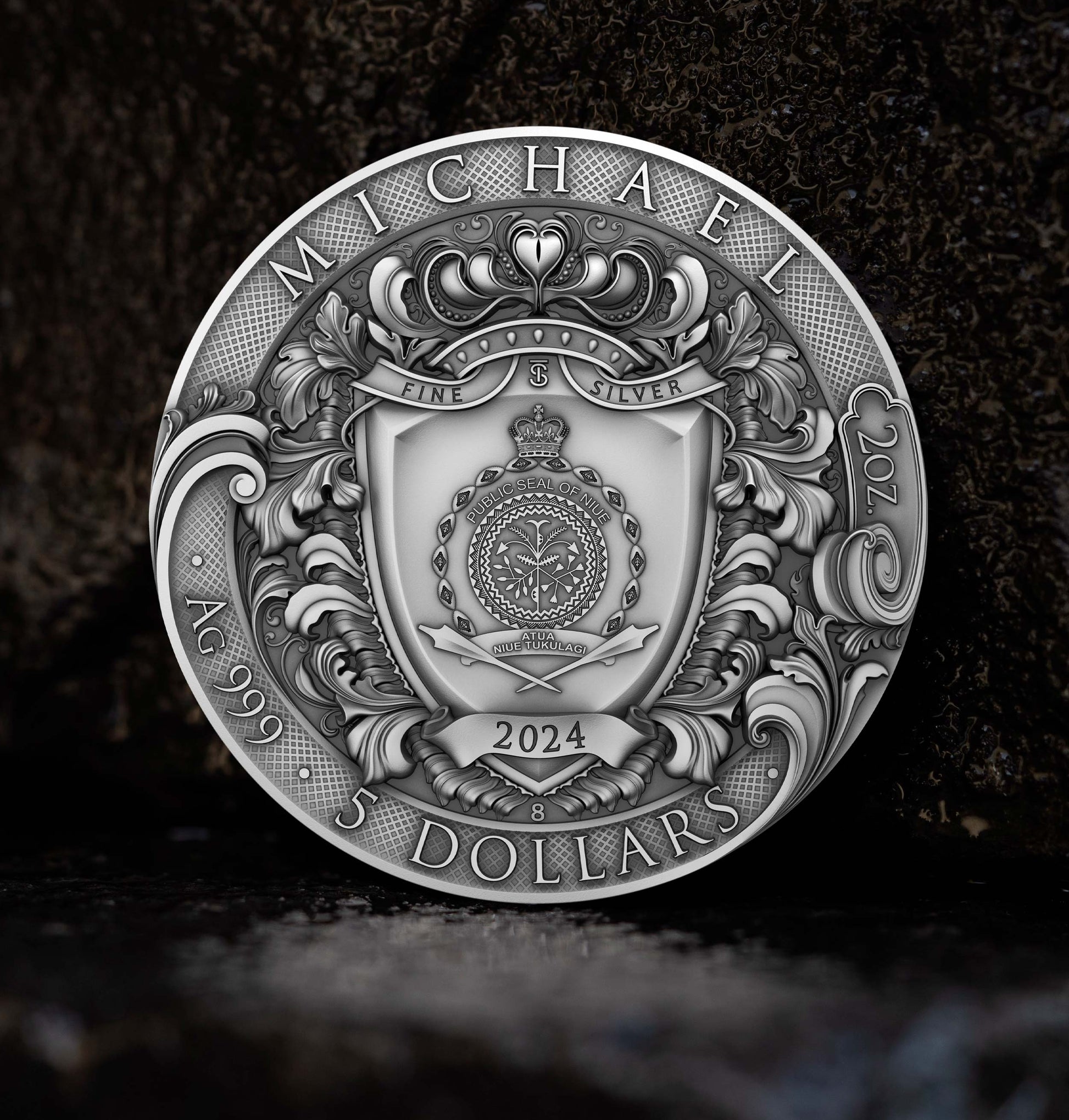 Product information Country Niue Years 2024 Face Value 5 Dollars Metal Silver Fineness (purity) .999 Weight 62.2 g (2 oz) Diameter 45 mm Quality Antique Finish + Gold Plating Mintage 500 pcs Certificate (COA) Yes Presentation case (box) Yes Series Archangels